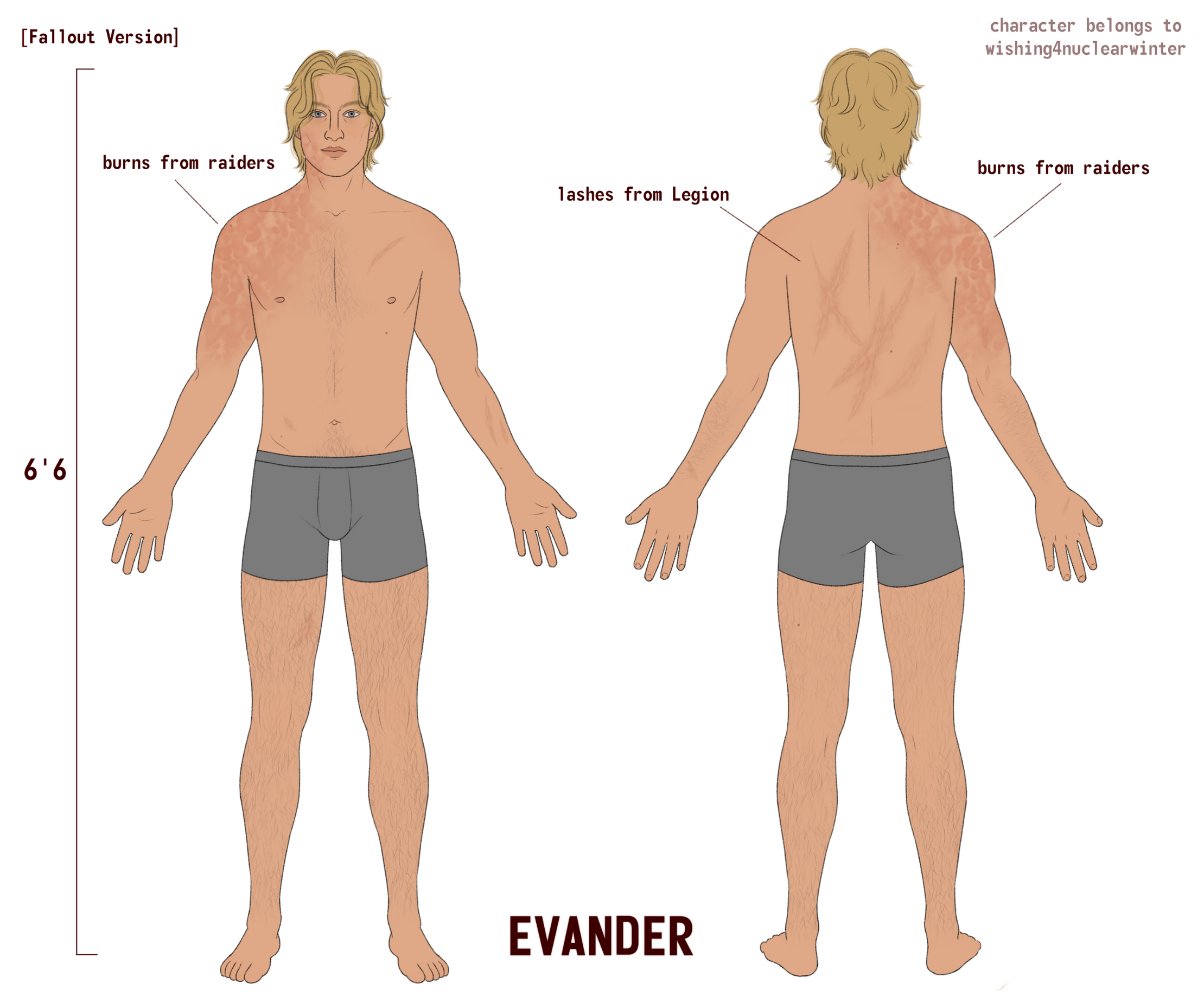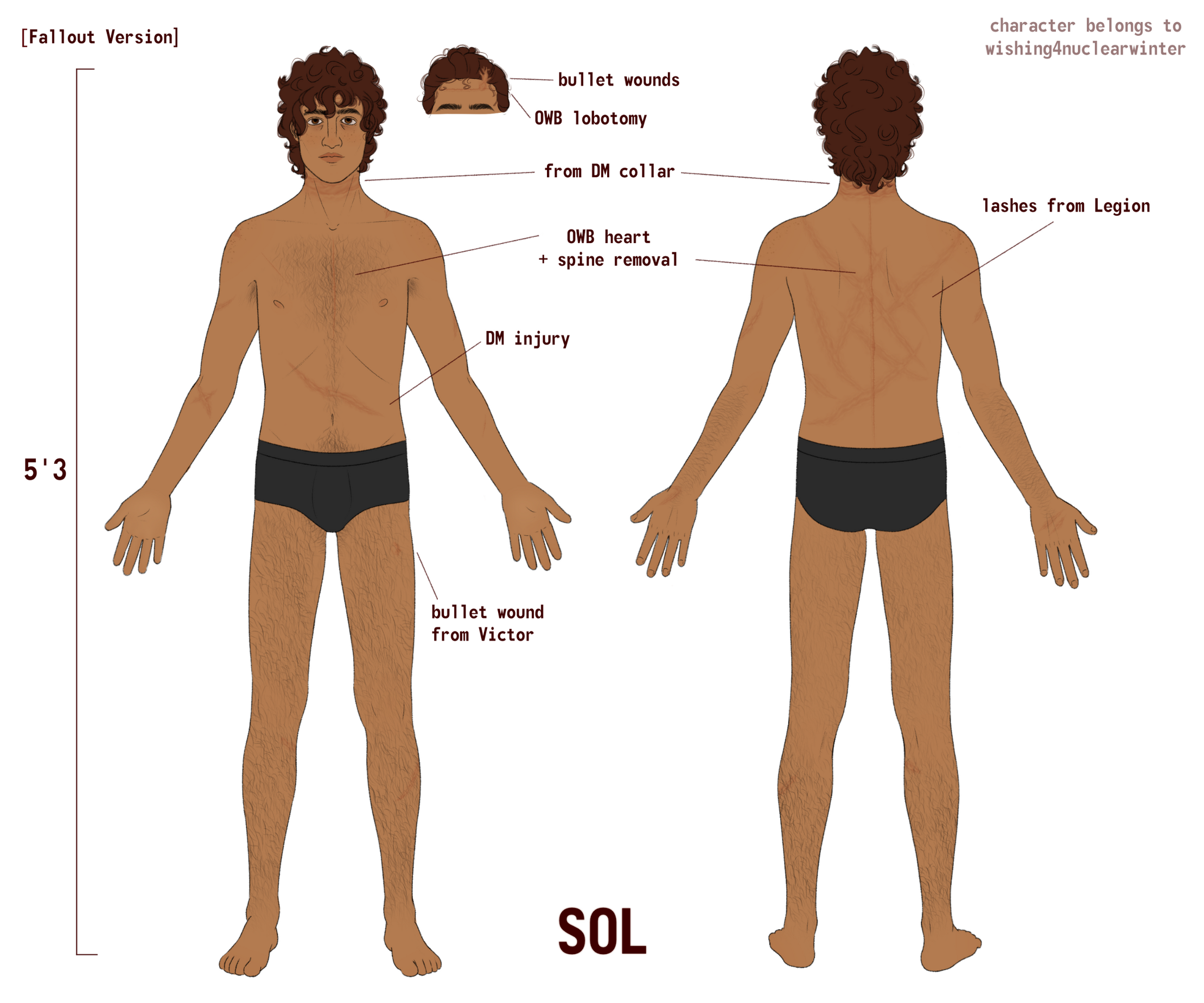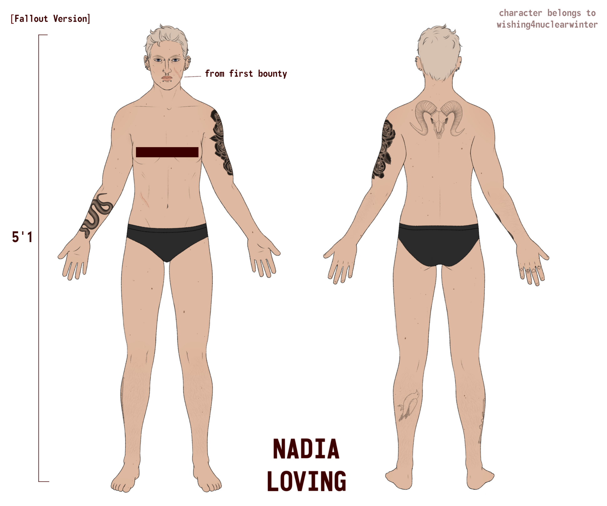 Scars: Heavy scarring around left eye, top surgery scars (no nipple grafts), mirelurk claw mark on left arm