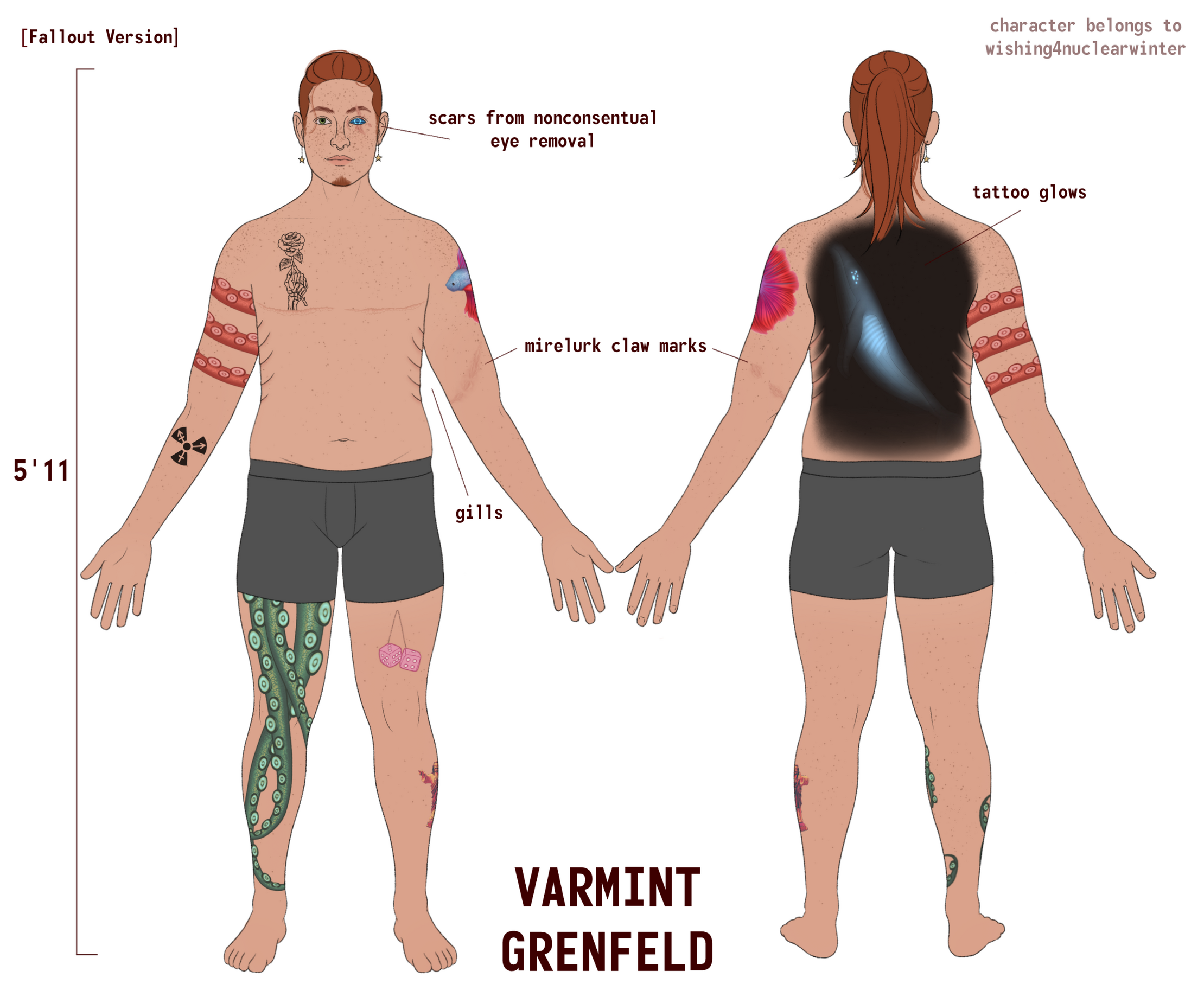Tattoos: Betta fish on left upper arm, red octopus tentacle wrapped around right upper arm, trans radioactive symbol on right inner forearm, black lined skeleton hand holding rose on right side of chest, blue/green octopus tentacle running down right leg, pink fuzzy dice on left thigh, smiling Jesus figurine on outer left calf, large glowing whale covering back, 'save a horse' on left ass cheek, 'ride a cowboy' on the other cheek