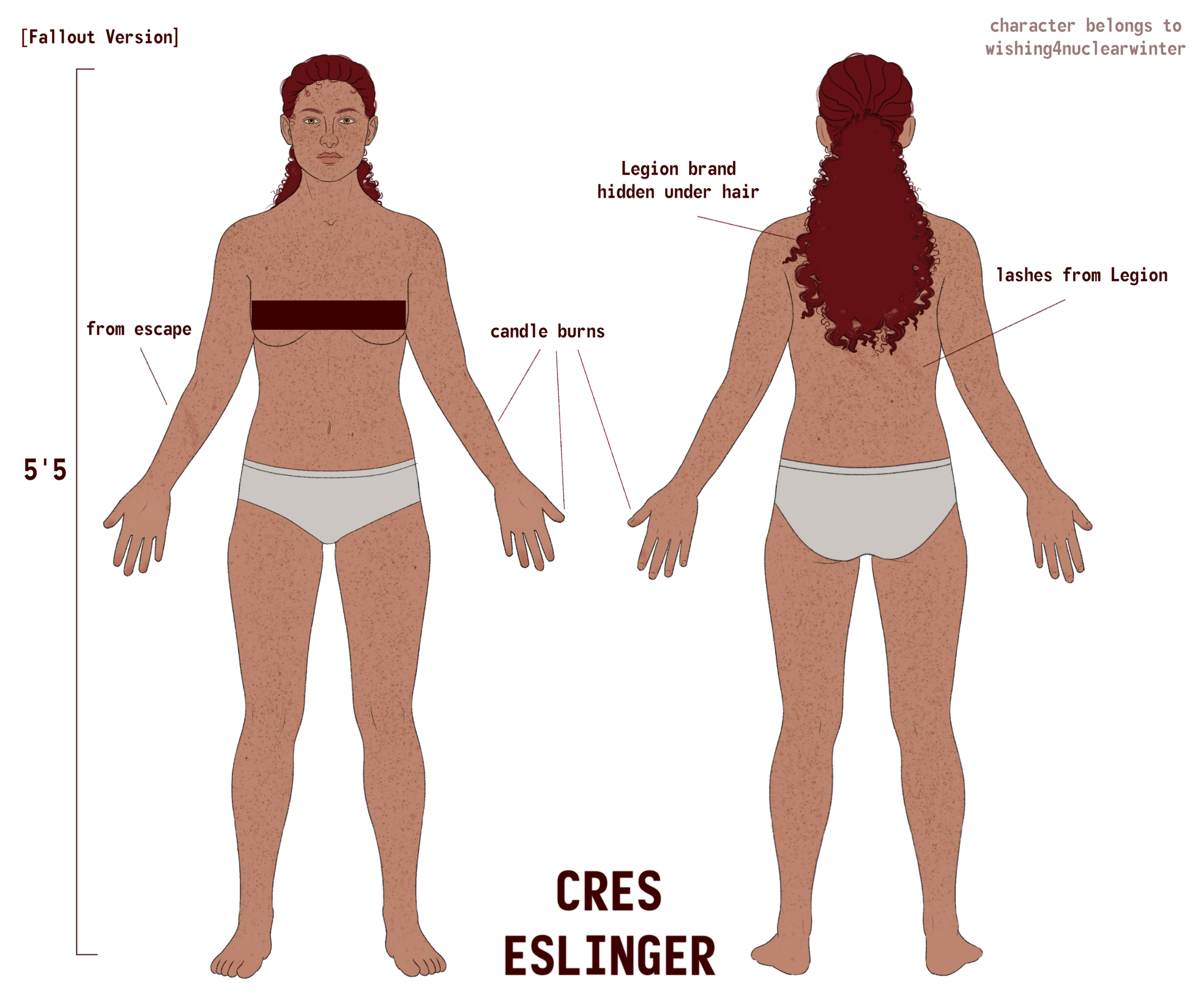 Scars: Bullet wounds on head almost always hidden under hair, wide band across neck from the bomb collar rubbing skin off during Dead Money, surgery scars across head, chest, and back from OWB, small nicks all over, lash marks across backPreferred clothing: Jean jacket, cuffed jeans, hiking boots. Post-canon also shorts, skirts, and occasionally dressesAccessories: Ornate dagger with leather thigh holster; Pip-Boy 3000