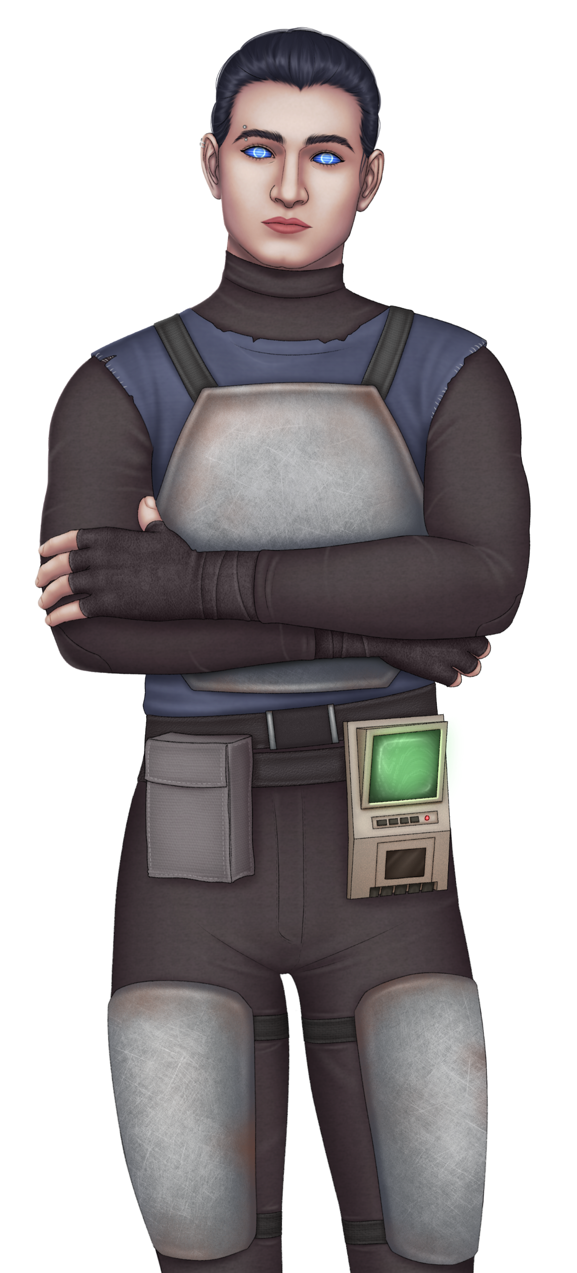 Eye color: Green right eye; glowing blue cybernetic left eye