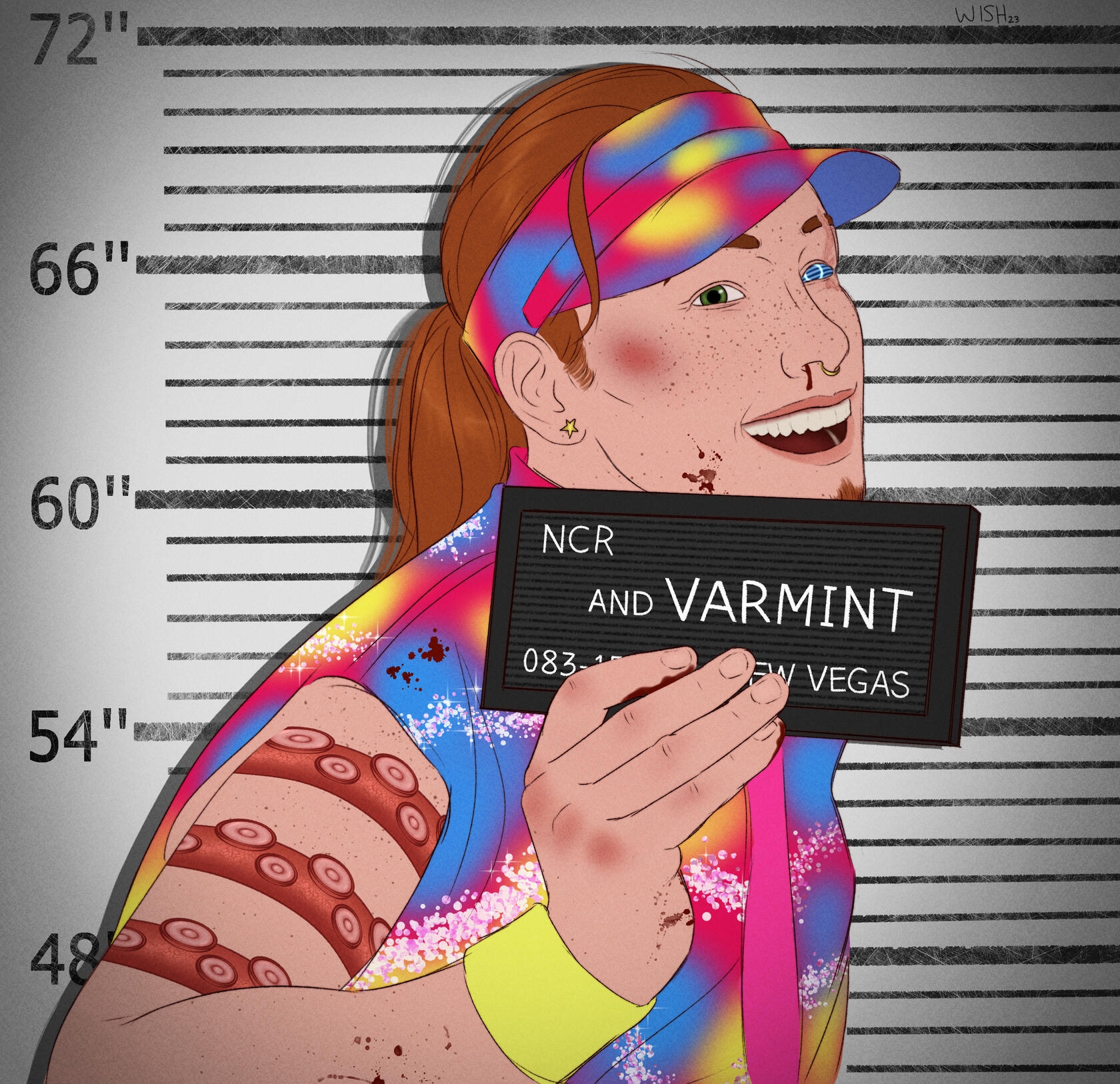 Other: Gills along ribcage, webbed feet, very long arms, large hands and feetPreferred clothing: Anything, everything, nothing. They’ve been sporting a cowboy aesthetic since going to the Mojave though (or attempting to). They just want their clothes to be as bright, gaudy, and attention catching as possible. Their traveling clothes are more plain, usually consisting of overalls and a colorful short sleeve button upAccessories: Gay little neck bandana, funky earrings