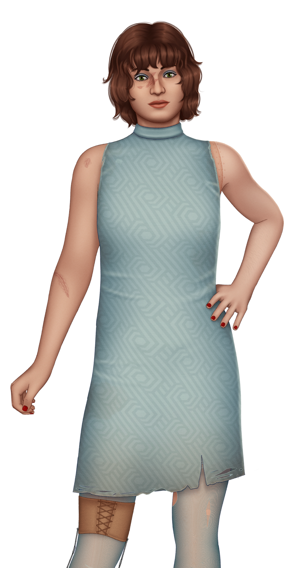 Scars: Bullet wounds on head almost always hidden under hair, wide band across neck from the bomb collar rubbing skin off during Dead Money, surgery scars across head, chest, and back from OWB, small nicks all over, lash marks across backPreferred clothing: Jean jacket, cuffed jeans, hiking boots. Post-canon also shorts, skirts, and occasionally dressesAccessories: Ornate dagger with leather thigh holster; Pip-Boy 3000