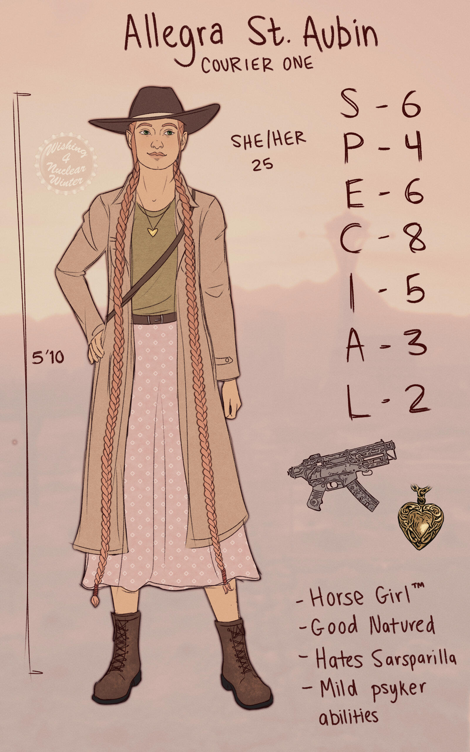 L - 5Tag skills: Guns, Melee Weapons, SneakTraits: Small frame, ClaustrophobiaNotable Perks: Ain't Like That Now, Pack Rat, Animal Friend, Fight the Power!, Certified Tech, Jury Rigging, NinjaCombat style: Sniper with extensive melee trainingWeapons: Silenced sniper rifle (swapped for Christine's COS Silencer post-canon), ornate dagger, combat knife. Additional small blades hidden in clothing and bag