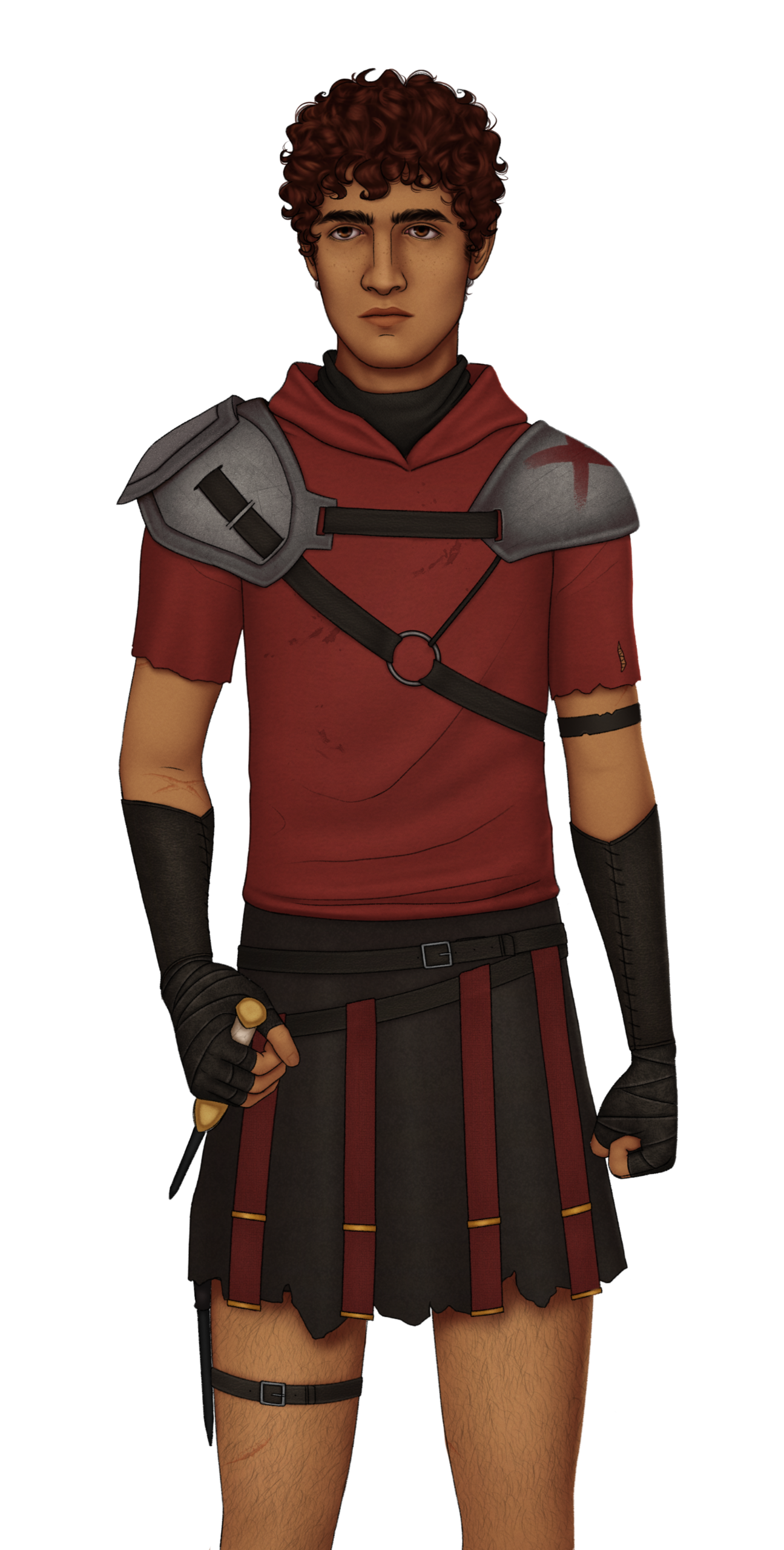 Clothing: [When at base] Legion uniform with a hood sewn onto the shirt and metal pauldrons (taken from the in-game leather armor set) instead of standard football pads. Black face wrap is worn around neck when in not use. Black leather bracers and hand wraps, doubled over belt with a long ornate dagger attached, thigh holster for combat knife. Hood and face mask is always worn when in uniform outside of camp